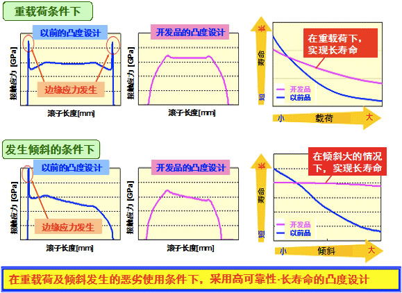 在新興市場惡劣的使用環(huán)境下,為防止軸承的使用壽命降低,對軸承的外圈,內(nèi)圈滾道面及滾子的滾動面進(jìn)行了最適的凸度設(shè)計(jì),可以抑制邊緣應(yīng)力的發(fā)生。另外,也容許因安裝不良導(dǎo)致的軸承傾斜。 而且,采用最新的加工設(shè)備,實(shí)現(xiàn)了適用于所有條件下的凸度的加工。