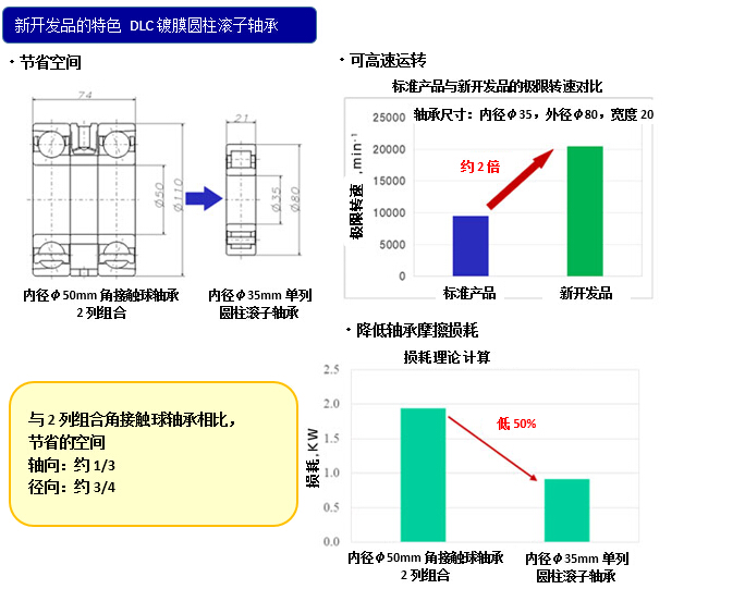 由于增加了DLC鍍膜,提升了圓柱滾子軸承的耐打滑擦傷性能,使其可用于高速輕載的渦輪制冷機用壓縮機,提高軸承可靠性的同時,降低了摩擦損耗。