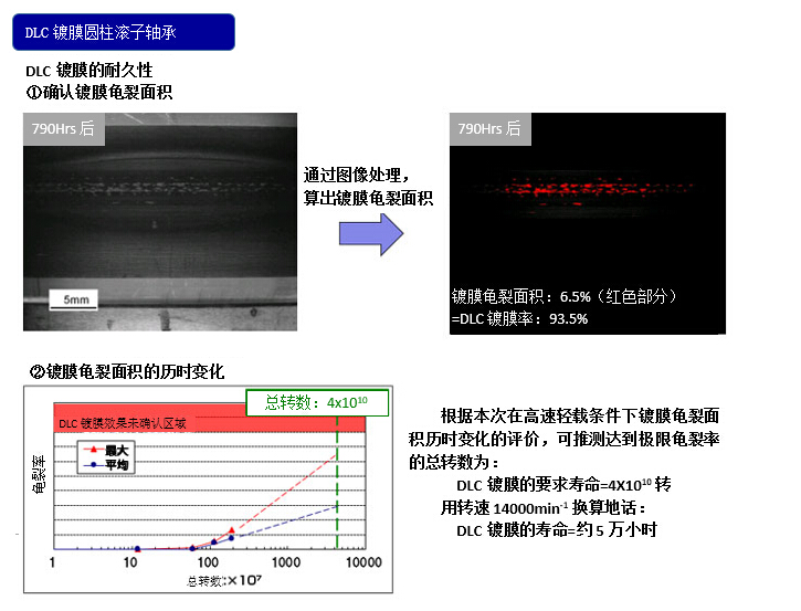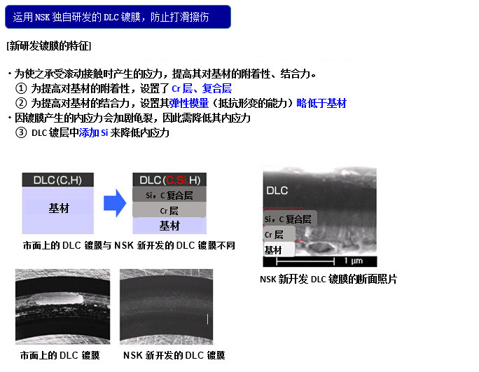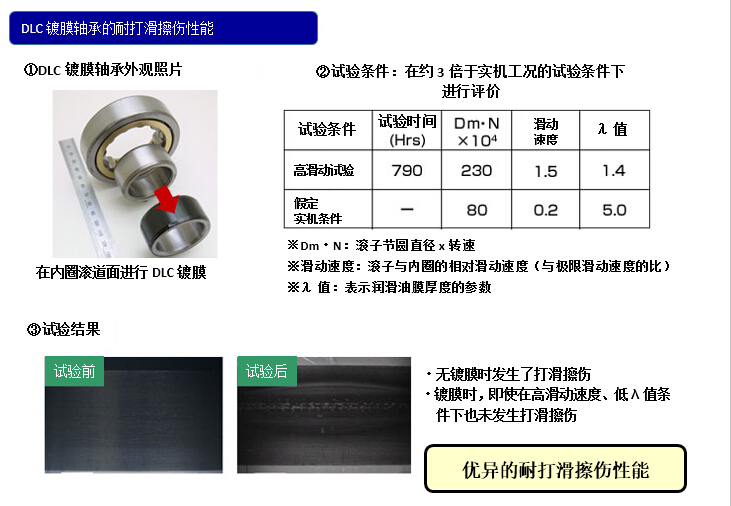 本產(chǎn)品中使用了高速運轉(zhuǎn)下也極耐龜裂的滾動軸承專用DLC鍍膜,同時優(yōu)化了內(nèi)部設計,即使在高速輕載、潤滑極差、易打滑等苛刻工況下,也能有效抑制打滑擦傷,具有優(yōu)越的耐久性能。