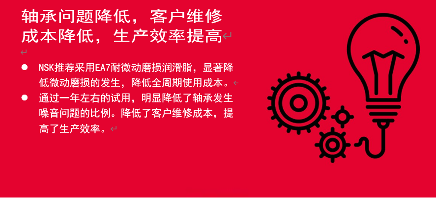 根據分析結果和客戶現狀,NSK推薦了封入耐微動磨損EA7潤滑脂的深溝球軸承,有效地防止了軸承發生微動磨損,延長了軸承的使用壽命。