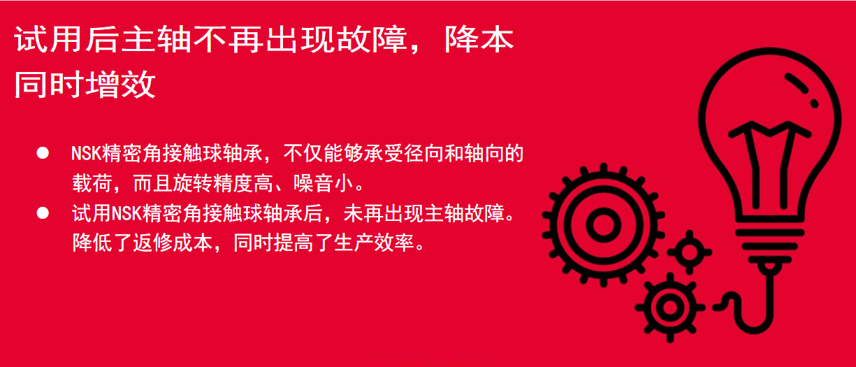 NSK技術專家經過現場工況調查,故障原因分析、評估、計算后,推薦了NSK的精密角接觸球軸承。主軸裝機運行試用半年后,無任何主軸故障發生,提高了客戶設備運轉率,降低了維修成本,提升了工件加工效率。