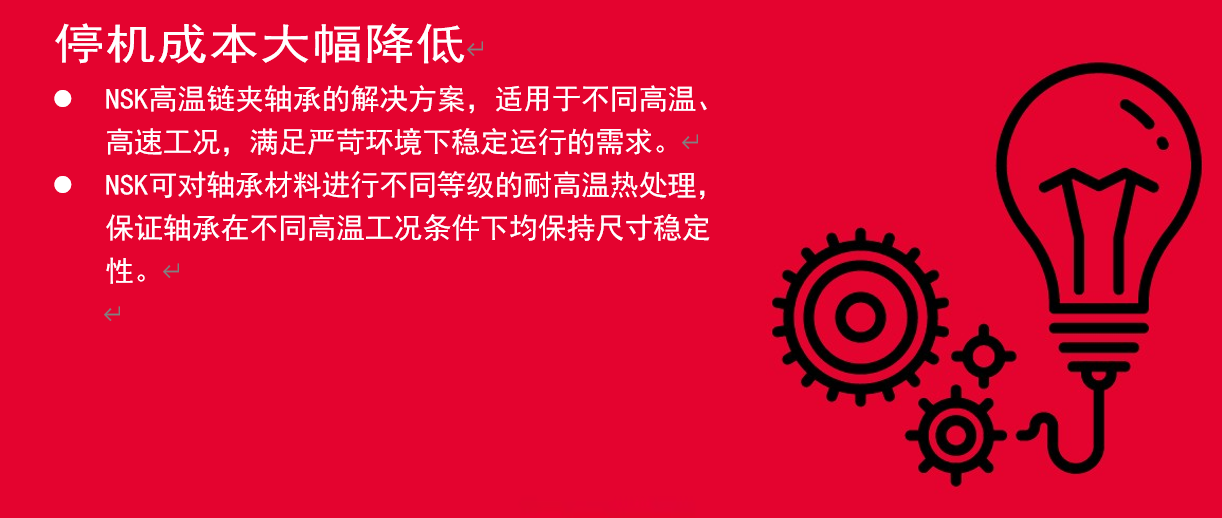 - NSK高溫鏈夾軸承采用特殊結構進行密封,采用耐高溫潤滑脂,在高速工況下,也可以最大限度抑制潤滑脂的泄露問題,具備良好的高速運行能力與潔凈性能。