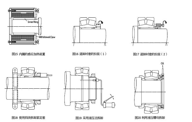大型軸承,利用液壓拆卸更加容易,如圖19。在錐孔軸上的油孔中加壓送油,使內(nèi)圈膨脹,拆卸軸承。操作中防止軸承突然脫落,也可使用液壓螺母拆卸襯套。圖20是利用液壓螺母拆卸襯套的方法。